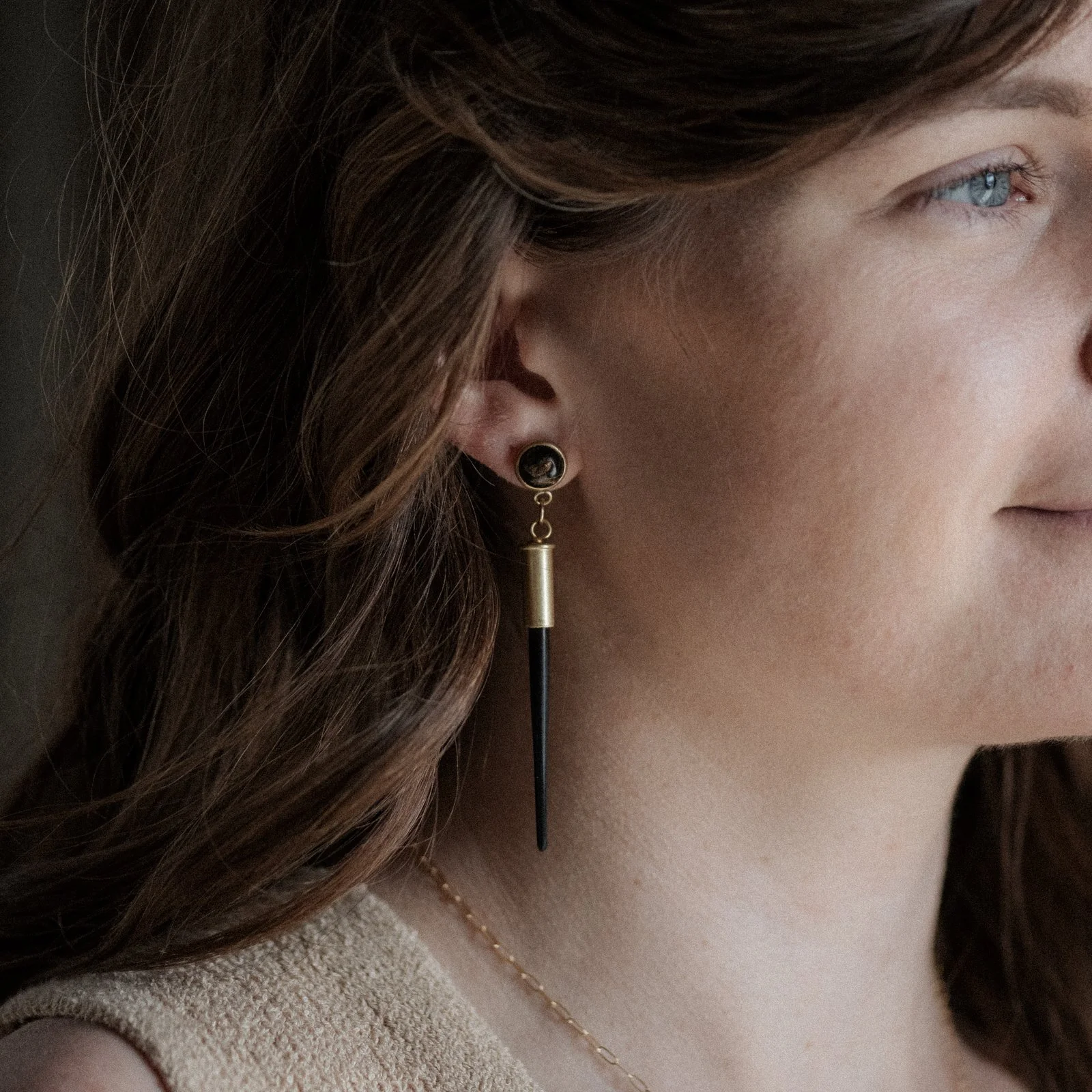 Natural, all black porcupine quills set in .22 bullet casings, hanging from natural 8mm copper obsidian stones set in brass bezels with .925 sterling silver stud posts.